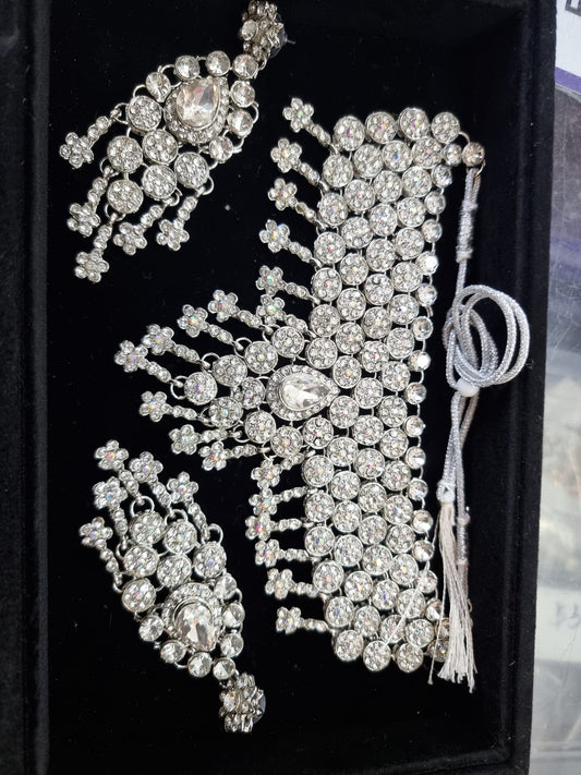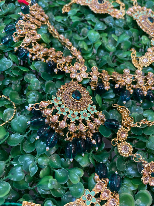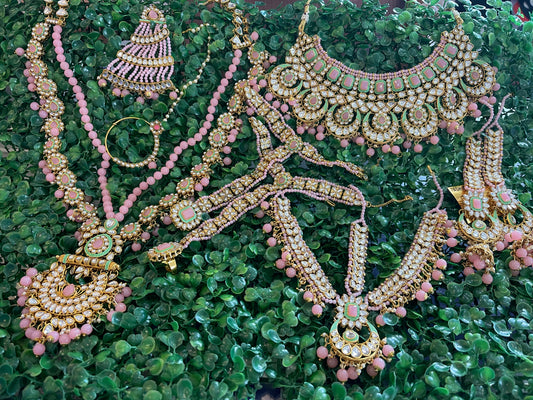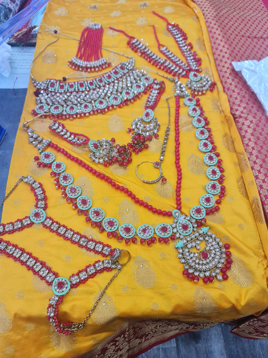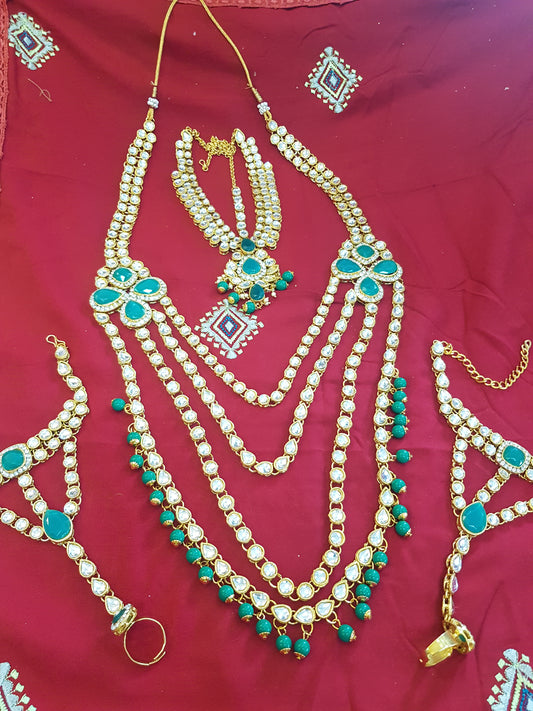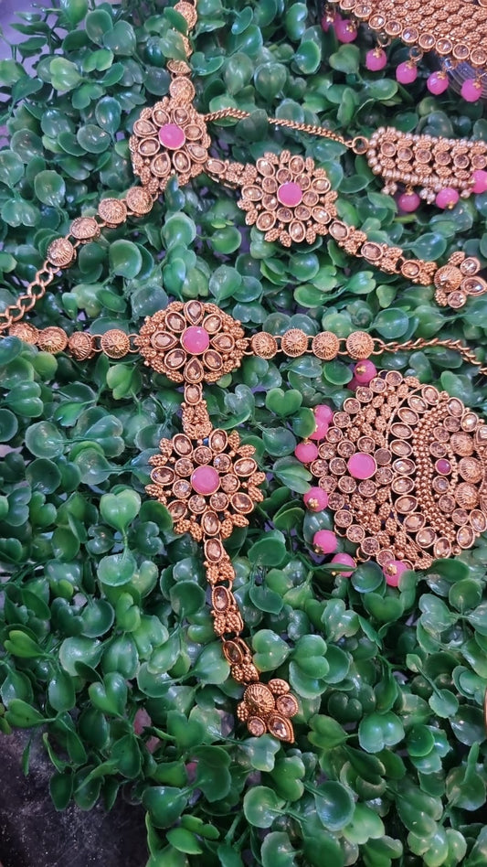 Beautiful designer Ethnic Indian Traditional Gold Plated Kundan Dulhan Bridal Jewellery Set with Choker Earrings Maang Tikka Hathphool for Women