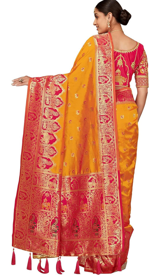 Beautiful designer Women's Banarasi Silk Blend Woven Zari With Tussles Saree and Jacquard Woven Blouse Piece
