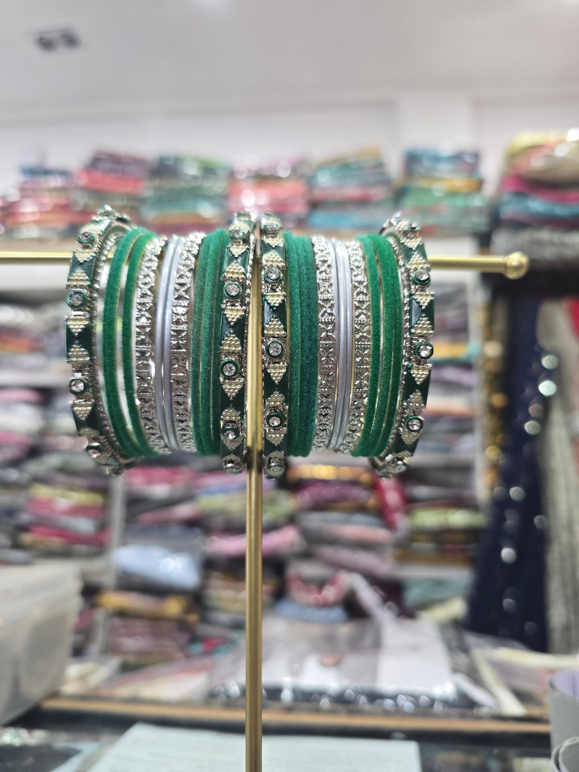 "Get ready to add a touch of elegance to your outfit with our Beautiful Designer Bangle Set! This set features a mix of metal and velvet bangles, providing a unique and chic look. Elevate your style and make a statement with this must-have accessory."