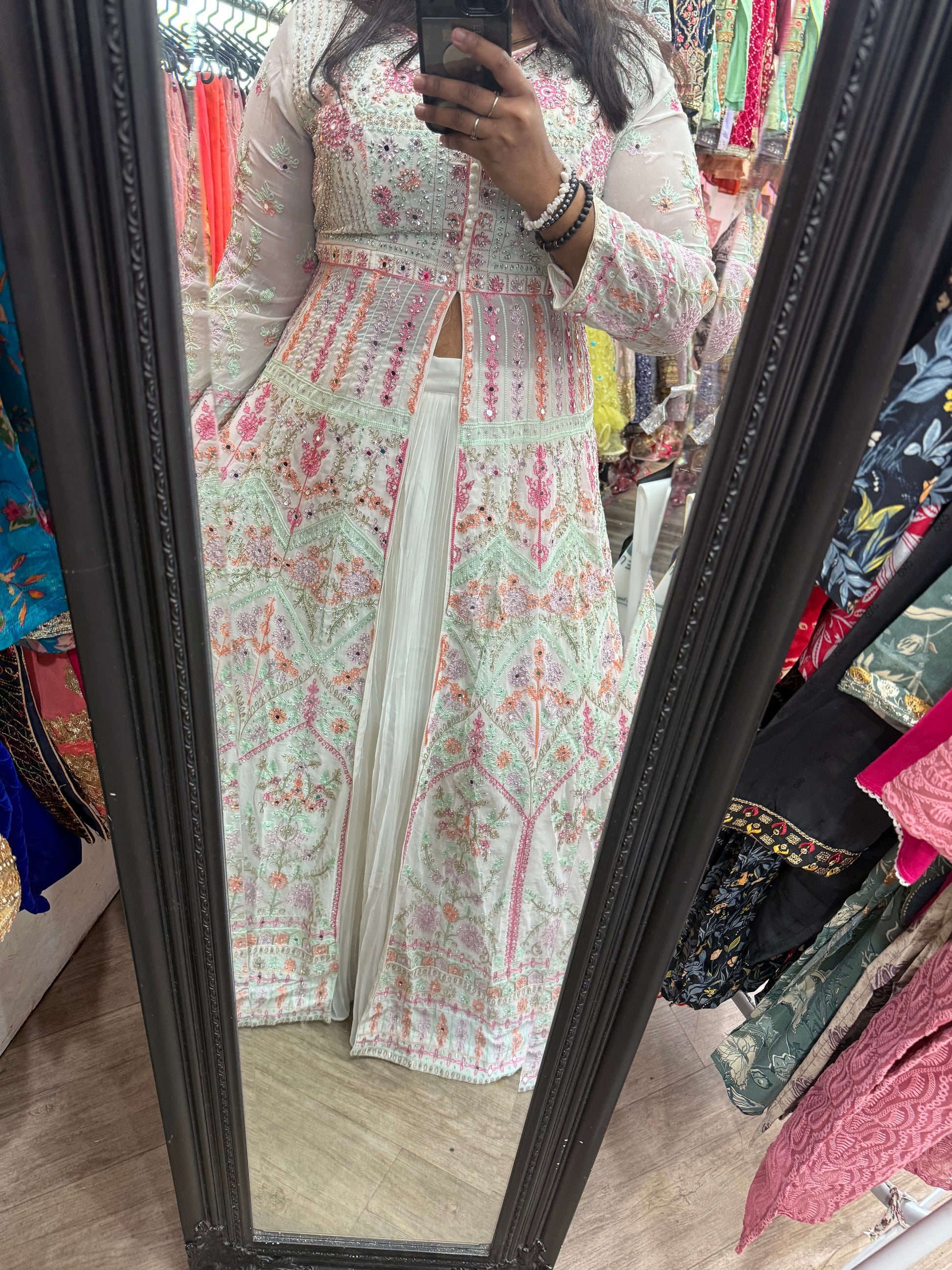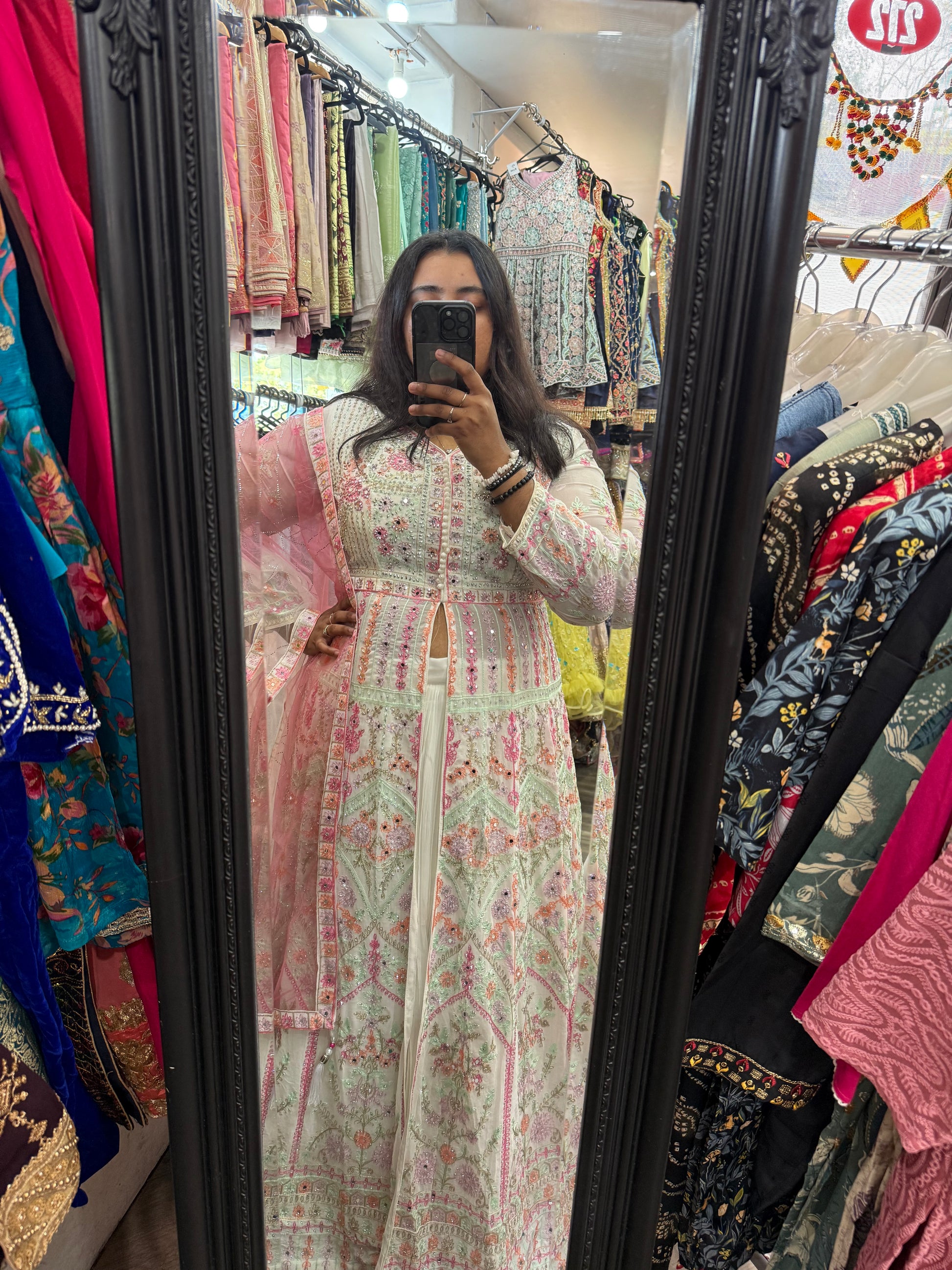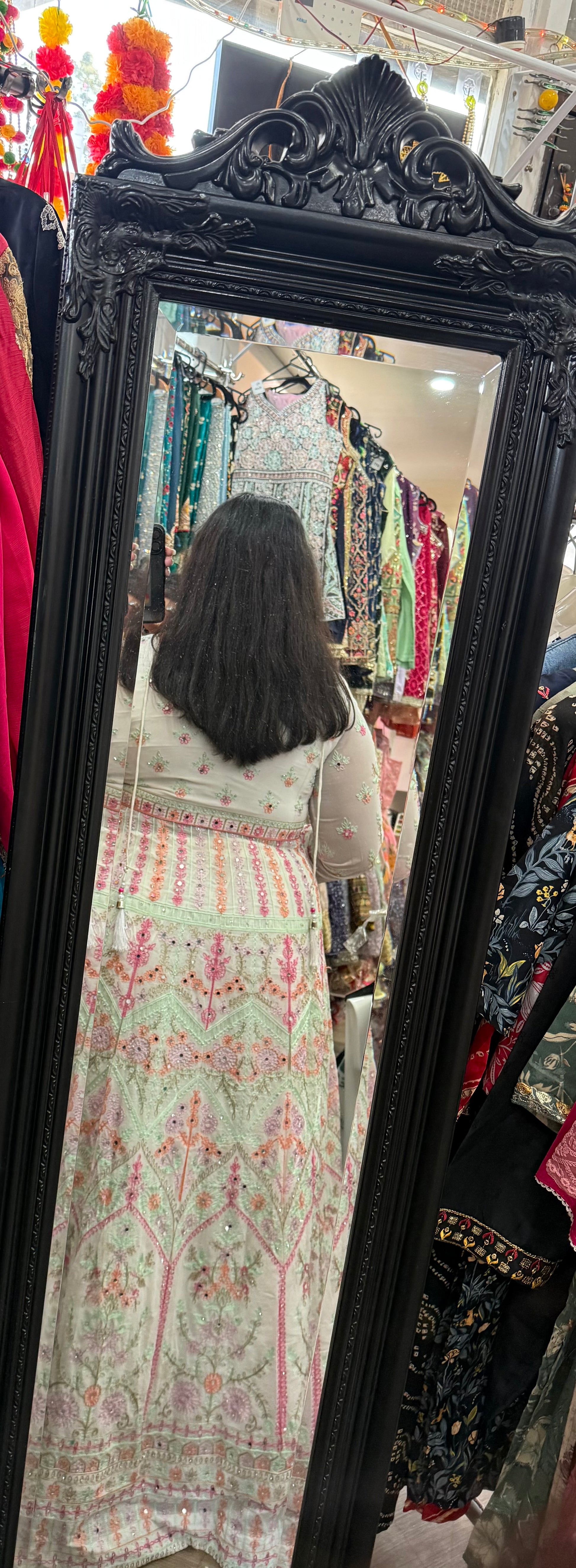 Elevate your style with our beautiful designer long top lengha choli. Made from high-quality geogrette fabric, this piece features stunning mirror work on the front and back. Perfect for any occasion, our top lengha choli offers both elegance and comfort. Embrace quality and sophistication with our one-of-a-kind design.