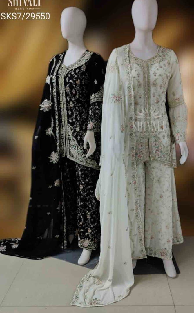 This beautiful designer plazo suit is crafted with luxurious gorgette fabric, featuring exquisite embroidery and dazzling stone work. With front and back fully embroidered, it offers a stunning and elegant look for any occasion. Elevate your style with this sophisticated plazo suit.