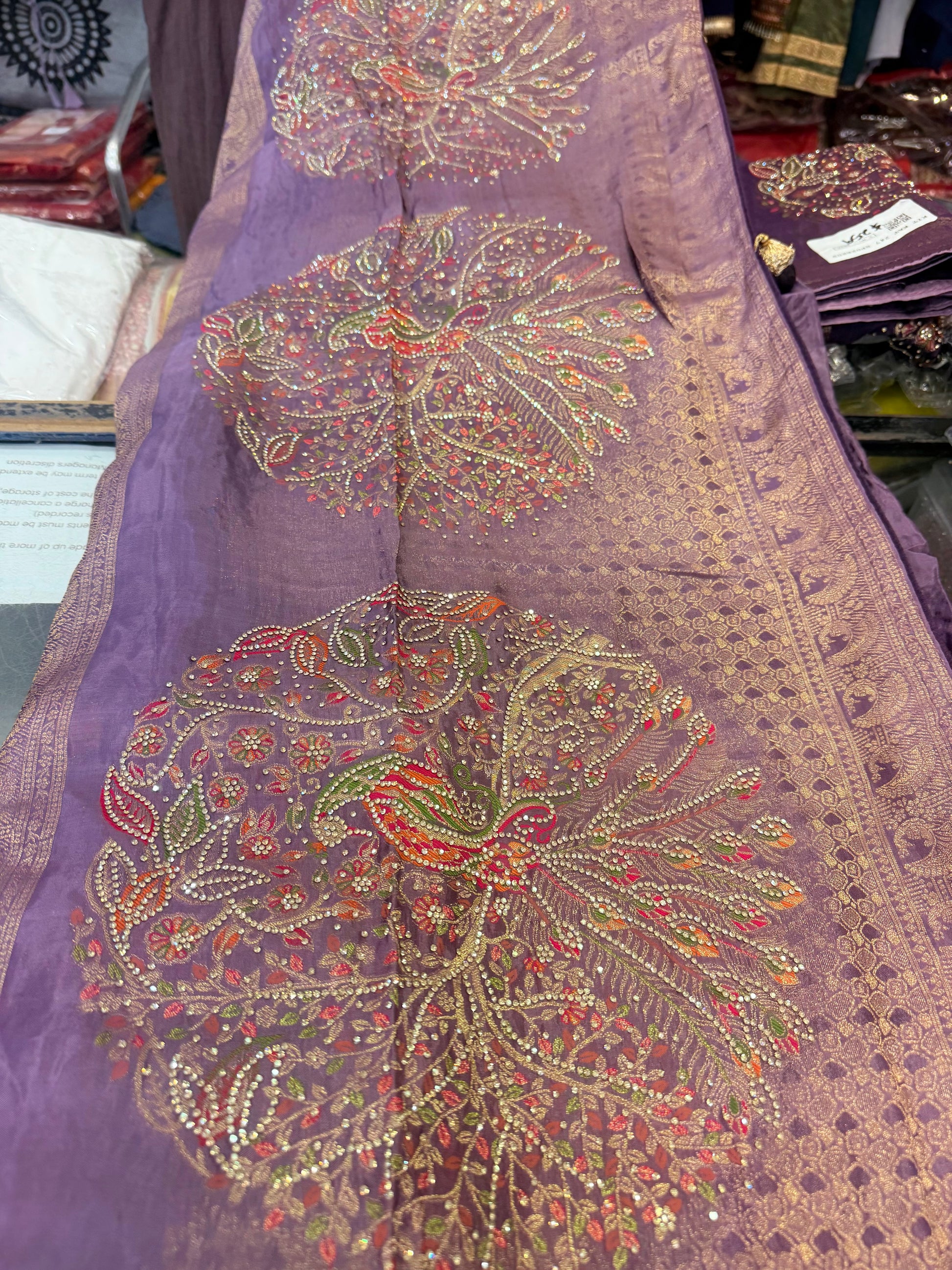 Experience luxury and elegance with our Beautiful designer pure silk saree. Made with pure silk and embellished with stunning stone work, this saree exudes an ethnic charm. Elevate your style and embrace timeless traditional beauty.