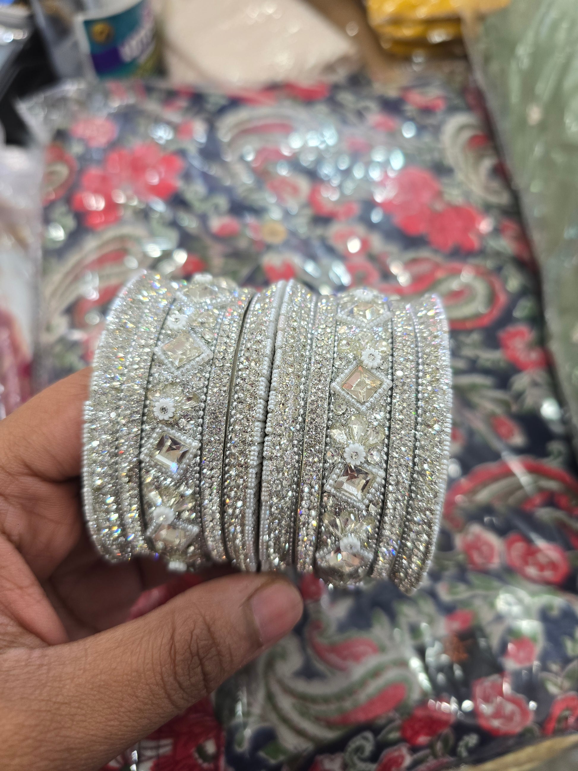 Indulge in elegance and style with our Beautiful Designer Silver Bangle Set. this set of bangles radiates sophistication and class. Perfect for any occasion, these bangles add a touch of glamour to your outfit while reflecting your refined taste. Elevate your look with our designer silver bangle set.